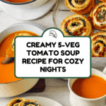 A rich and velvety creamy tomato soup packed with five vibrant vegetables: onions, carrots, red peppers, sweet potato, and tomatoes. Perfectly seasoned with oregano and rosemary, this comforting soup combines fresh ingredients and creamy double cream for a satisfying bowl that’s easy to prepare and ideal for any season.