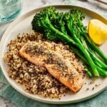 A white plate holds a meal with three parts: a base layer of light brown and fluffy quinoa spread out mostly on one side, topped with a large, grilled salmon fillet that has a golden-brown crust speckled with herbs on the right side, and bright green steamed broccolini placed across the middle, with crisp stems and leafy tops. A small wedge of yellow lemon rests on the left edge of the quinoa. The plate is set on a white marbled surface with a folded green cloth and silver cutlery on the side, with a glass of water faintly visible in the background. photo taken with an iphone --ar 4:5 --v 7