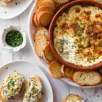 - Garnish and serve: Sprinkle finely chopped chives over the top. Let the dip cool slightly, then serve warm with crostini, crackers, or warm bread.