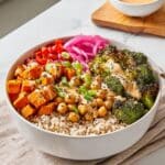 - Assemble Bowls: Divide the cooked grains evenly among four bowls. Top each bowl with the roasted vegetables and crispy chickpeas. Drizzle with one or both of the prepared sauces according to your taste. Garnish with thinly sliced green onions, toasted sesame seeds, and optional pickled red onions. Serve immediately and enjoy!