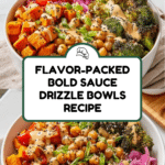 These Bold Sauce Drizzle Bowls feature a vibrant mix of roasted vegetables and crispy chickpeas served over fluffy brown rice or quinoa. Enhanced with a rich miso-butter sauce and a spicy-sweet gochujang-maple drizzle, this wholesome and flavorful dish is perfect for a nutritious, satisfying meal.