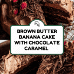 Keywords: banana cake, brown butter cake, chocolate caramel frosting, homemade cake, layered cake, dessert recipe, autumn cake
