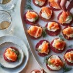 The image shows multiple red, round crackers placed on a large oval white plate and a small round white plate, all set on a white marbled surface. Each cracker is topped with a creamy white layer of sauce or cream, with some topped by orange smoked salmon slices and others by a white topping, possibly cream cheese or sour cream. Small green sprigs of dill garnish each cracker, adding a fresh contrast to the deep red and white colors. A woman’s hand is reaching toward one of the crackers on the small plate. Nearby, there are clear drinking glasses and a copper bell, completing the scene. Photo taken with an iphone --ar 4:5 --v 7