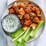 8. Serve: Plate the buffalo cauliflower alongside celery sticks and the homemade ranch dip for a refreshing and spicy bite.