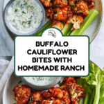 Keywords: buffalo cauliflower, vegetarian appetizer, spicy cauliflower, baked cauliflower, buffalo sauce, ranch dip, healthy snacks