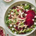 A vibrant and satisfying Chicken & Beetroot Lentil Salad that combines tender shredded chicken, earthy puy lentils, sweet beetroot, and fresh herbs, all tossed in a tangy honey-Dijon mustard dressing and finished with creamy goat’s cheese and juicy pomegranate seeds. Perfect for a healthy lunch or light dinner.