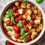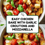 This chicken bake with garlic croutons is a deliciously simple dish perfect for a weeknight dinner. Tender chicken breasts are layered with rich passata, juicy cherry tomatoes, and melted mozzarella, then topped with crunchy, flavorful garlic croutons. It’s a comforting meal that comes together easily and pairs wonderfully with a fresh green salad.