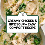 This creamy chicken and rice soup is a comforting and hearty dish, perfect for a cozy meal. Made with tender shredded chicken, cannellini beans, microwave rice, and fresh leafy greens, it combines wholesome ingredients to create a thick, flavorful soup with a bright lemon zest finish.