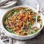 Keywords: green bean casserole, mushroom casserole, holiday side dish, creamy casserole, crispy onion topping