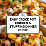 This Crock Pot Chicken & Stuffing Dinner is an easy, comforting one-pot meal perfect for busy weeknights. Tender chicken breasts cook slowly beneath a creamy sauce, mixed vegetables, and a fluffy stuffing topping, making for a hearty and satisfying dish.