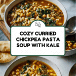 A comforting and flavorful curried chickpea brothy pasta that combines tender chickpeas, vibrant kale, and small pasta shapes in a spiced lentil and tomato base. Perfect for using up leftover coconut, curry leaf, and turmeric saucy lentils, this dish is both hearty and healthy, served best with flatbreads for dipping.