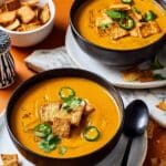 A comforting curried coconut lentil soup infused with aromatic spices and creamy coconut milk, served with crunchy cumin-spiced naan croutons and fresh garnishes. This hearty, flavorful soup is perfect for a cozy meal and packs a nutritious punch with red lentils and warming turmeric.