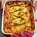 - Rest and Decorate: Remove from oven and allow the lasagne to stand for 5 minutes before serving. Optionally, decorate the top with freshly snipped chives, spelling out a message or simply garnishing.