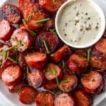 This Easy Air Fryer Kielbasa recipe delivers perfectly crispy and flavorful kielbasa bites, coated with a tangy mustard and brown sugar glaze. Ready in just minutes using an air fryer, this appetizer or snack pairs beautifully with a creamy mustard dipping sauce topped with fresh chives for a delicious and satisfying treat.