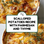 This Easy Creamy Scalloped Potatoes recipe features thinly sliced Yukon Gold potatoes baked in a rich, garlicky Parmesan cream sauce with fresh thyme. This classic comfort dish combines a velvety sauce with tender, golden-baked potatoes, perfect as a hearty side for any meal.