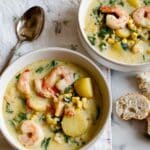 This Garam Masala Prawn & Corn Soup is a flavorful and comforting dish featuring tender prawns, sweet corn, and new potatoes simmered in a spiced broth infused with garam masala and curry powder. Garnished with fresh coriander and lime wedges, it’s a perfect blend of warming spices and fresh ingredients, served with crusty bread for a satisfying meal.