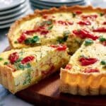 This garden vegetable and goat’s cheese quiche is a delightful and colorful dish featuring a crisp blind-baked pastry case filled with a creamy mixture of sautéed courgettes, runner beans, peas, and salad onions. Enriched with a smooth milk and flour-based sauce, beaten eggs, and topped with slices of rich goat’s cheese and fresh vine tomatoes, this quiche bakes to a golden perfection, offering a deliciously savory flavor profile perfect for lunch or dinner.
