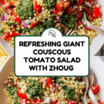 A vibrant and refreshing giant couscous and tomato salad featuring a zhoug-style dressing. This Mediterranean-inspired dish combines juicy vine tomatoes, tender giant couscous, fresh herbs, and a spicy, garlicky green chili dressing to create a flavorful and colorful side or light meal.