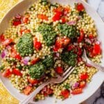 Keywords: giant couscous salad, tomato salad, zhoug dressing, Mediterranean salad, healthy salad, vegetarian recipe