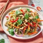 - Step 8: Serve the stir-fry topped with toasted cashews, extra coriander, and sliced red chilli if desired.