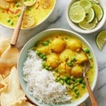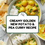 A vibrant and aromatic Golden New Potato & Pea Curry featuring a blend of fresh spices, creamy coconut milk, and zesty lime, served over sticky jasmine rice. This comforting vegetarian curry highlights tender new potatoes and sweet peas infused with Thai flavors, perfect for a satisfying and flavorful meal.