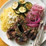 Keywords: grilled lamb chops, hummus mash, Mediterranean lamb recipe, healthy lamb dinner, grilled courgettes, marinated onions