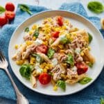 A round white plate holds a colorful pasta salad with three main layers. The bottom layer consists of light yellow penne pasta scattered across the plate. On top of the pasta, there is a mix of bright yellow corn kernels, halved red cherry tomatoes, and chunks of light brown tuna spread evenly. The dish is garnished with fresh green basil leaves and drizzled with a creamy white dressing, giving the salad a slightly wet texture. The plate is set on a blue cloth, against a white marbled surface. Nearby, there is a silver fork resting on the edge of the plate and a glass of water with a lemon slice in the background. photo taken with an iphone --ar 4:5 --v 7