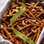 A savory and spicy Holiday Pretzel Mix combining salted mini pretzel sticks and mixed nuts coated in a flavorful buttery blend with Worcestershire sauce, Dijon mustard, and a medley of spices. Perfectly toasted in the oven for a crunchy, festive snack that can be enjoyed warm or at room temperature.