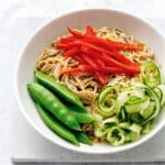 This refreshing Japanese noodle salad features soba noodles tossed with crisp sugar snap peas, red pepper, and cucumber ribbons, all dressed in a creamy sesame tahini dressing. It’s a quick and simple dish perfect for a light lunch or dinner with vibrant flavors and a satisfying texture.