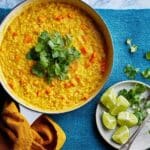 - Finish and serve: Adjust seasoning if needed. Sprinkle the finely chopped coriander over the cooked kitchari. Serve hot with lime wedges on the side to squeeze over just before eating.