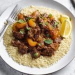 A flavorful and aromatic Lamb & Apricot Stew that combines tender stewing lamb pieces with sweet dried apricots and a blend of Middle Eastern spices. This comforting dish is simmered to perfection and served with warm couscous, fresh herbs, and lemon wedges for a delightful and hearty meal.
