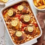 A flavorful and hearty lemon and herb chicken traybake served with tender butter beans and crispy potato wedges. This one-pan oven-baked dish combines juicy skin-on chicken thighs seasoned with mixed herbs and fresh lemon, cooked atop a savory tomato and butter bean base, accompanied by golden, seasoned potato wedges. Perfect for an easy, wholesome dinner with minimal cleanup.