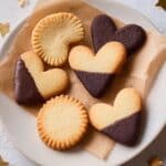 A white plate with a piece of crumpled brown parchment paper on it holds five shortbread cookies in different shapes. There is a heart-shaped cookie in the center with a light golden color, a scalloped round cookie with half of it dipped in dark chocolate on the right side, a round scalloped cookie in a light golden color to the left front, a butterfly-shaped cookie with a plain golden hue on the top left, and a slice-shaped cookie with a half dark chocolate coating on the top right. The plate is placed on a white marbled surface with scattered gold star confetti around it. Photo taken with an iphone --ar 4:5 --v 7
