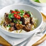 - Assemble and Serve: Divide the cooked noodles between two bowls. Spoon the hot beef stew over the noodles. Garnish with the remaining sliced chilli and coriander leaves. Serve with lime wedges for squeezing over the dish to add freshness and brightness.
