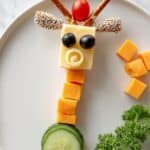 - Assemble Body: Stack a cube of cheddar cheese on the cucumber slice, then add a baby carrot on top followed by a cube of gouda cheese to build the giraffe’s body.