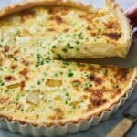 Keywords: New potato quiche, Montgomery cheddar, spring onion quiche, homemade pastry quiche, British quiche recipe, savory tart, vegetarian quiche