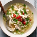 A white bowl on a white marbled surface holds a clear broth soup with visible layers of shredded white chicken, translucent cooked onions, chopped green herbs, bright red chili slices, and a heap of cooked rice on top. A spoon with a wooden handle rests inside the bowl on the left side, partially submerged in the soup. photo taken with an iphone --ar 4:5 --v 7
