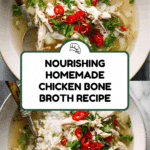 This nourishing bone broth recipe uses a meaty chicken carcass simmered with aromatic spices, lemon, and herbs to create a flavorful and mineral-rich broth. Paired with wholegrain basmati rice tossed in fresh coriander leaves, this comforting meal supports immune health and delivers a warm, satisfying experience.