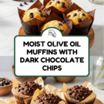 These Olive Oil Muffins with Dark Chocolate Chips are moist, flavorful, and perfectly balanced with the rich taste of olive oil and the sweetness of dark chocolate. Enhanced with almond milk and chopped roasted almonds, these muffins provide a delightful texture and nutty undertone, making them a delicious treat for breakfast or snack time.