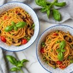 This one pot lightly creamy pasta is a flavorful and easy meal that combines whole wheat spaghetti with fresh vegetables, creamy Camembert, and fragrant basil. Perfect for a quick weeknight dinner, it packs a comforting richness without the heaviness of traditional cream sauces.