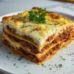 This Parmesan Garlic Beef Lasagna is the ultimate comfort food combining rich meat sauce, creamy ricotta blend, and a luscious garlic Parmesan béchamel sauce layered with oven-ready noodles and mozzarella cheese. Perfectly baked to golden bubbly perfection, it’s a hearty, satisfying meal ideal for family dinners or special occasions.