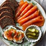 - Step 7: When ready to serve, thinly slice the salmon with a sharp knife, avoiding the skin. Serve alongside soft cheese, rye bread or bagels, dill pickles, and chopped dill for a delicious, self-serve platter.