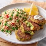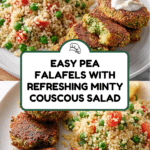 Pea falafels with minty couscous salad offer a fresh and vibrant twist on the classic falafel. Combining sweet peas and chickpeas, these crispy patties pair perfectly with a bright, herb-filled couscous salad for a satisfying vegetarian meal.