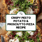 A gourmet Pesto Potato Prosciutto Pizza featuring a thin, crispy crust topped with basil pesto, thinly sliced potatoes, shallots, mozzarella, and crispy prosciutto, finished with creamy burrata and fresh micro arugula for a perfect balance of flavors and textures.