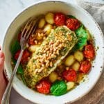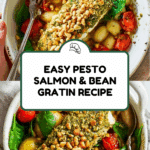 This pesto salmon and bean gratin is a vibrant, wholesome dish that combines tender salmon with creamy beans, fresh spinach, and a crunchy, cheesy topping. Perfect for a comforting weeknight dinner, it’s easy to prepare and even freezer-friendly.