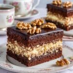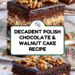 This Polish chocolate and walnut cake is a delightful combination of rich chocolate sponge layers and crunchy walnut meringue. Topped with a smooth chocolate glaze and decorated with walnuts, it’s an impressive treat perfect for any special occasion.