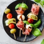 These Quick & Easy Antipasto Bites are perfect for entertaining or as a flavorful appetizer. Combining fresh grape tomatoes, olives, prosciutto, salami, mozzarella, basil, and marinated artichoke hearts, then drizzled with a balsamic glaze and olive oil dressing, they offer a delightful mix of savory and fresh flavors on convenient skewers.