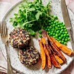 - Serve: Serve the quinoa-coated salmon and sweet potato fishcakes with fresh watercress and cooked peas. Optionally, prepare sweet potato crisps from the reserved skins by drizzling with olive oil, seasoning with salt, pepper or smoked paprika, and baking at 180C/160C fan/gas 4 until crisp.