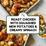 This roast chicken with squashed new potatoes and cheesy creamed spinach is a comforting, flavorful meal perfect for family dinners. Tender chicken legs roast alongside aromatic potatoes, while the rich spinach bake adds a creamy, cheesy finish. It’s a satisfying dish that’s easy to prepare and sure to please everyone at the table.
