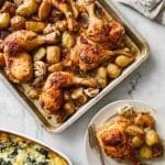 Store any leftover chicken, potatoes, and creamed spinach separately in airtight containers in the refrigerator for up to 2 days. Reheat gently in the oven to preserve texture, or microwave until warmed through. The prepared chicken legs held back before serving make a great cold lunch option the next day.